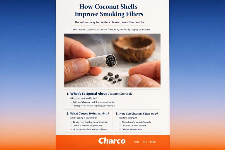 Coconut shell activated charcoal reduces gas-phase toxins and carbonyls, preserves flavor, and provides a durable, low-ash, sustainable smoking filter.